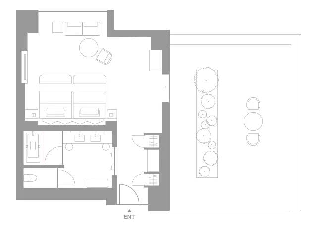 Experience the vibrant city life from the balcony of this guest room. At 64㎡, this expansive room comfortably accommodates up to three guests, offering contemporary comfort while retaining the essence of the Yasaka Kaikan. Indulge in a luxurious stay as you take in Kyoto's dynamic views.