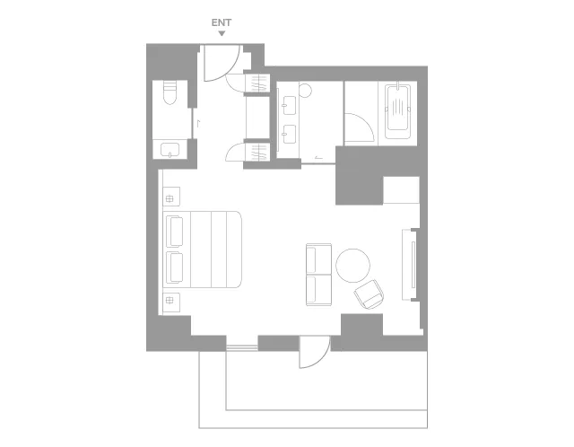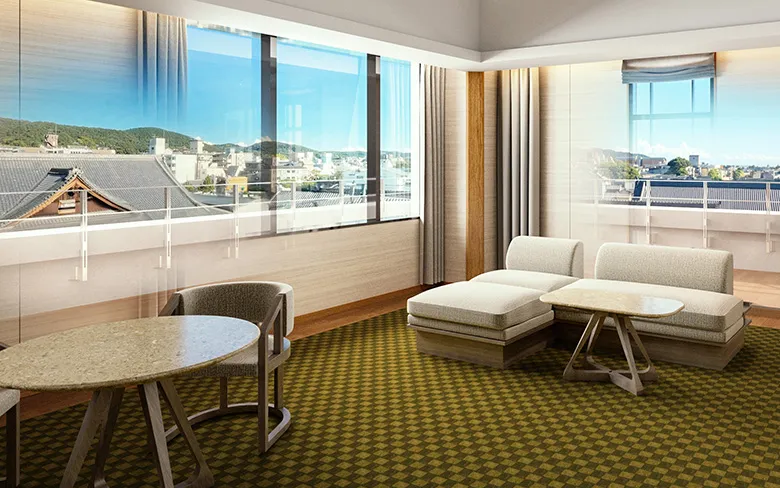 Infused with the legacy of the Yasaka Kaikan, this space is now elevated by the openness of a private balcony. Step outside, and the majestic presence of the Gion Kobu Kaburenjo theater and the lively flow of Hanamikoji street unfold before you. Savor a blissful moment, surrounded by a scene where history and culture are gracefully intertwined.