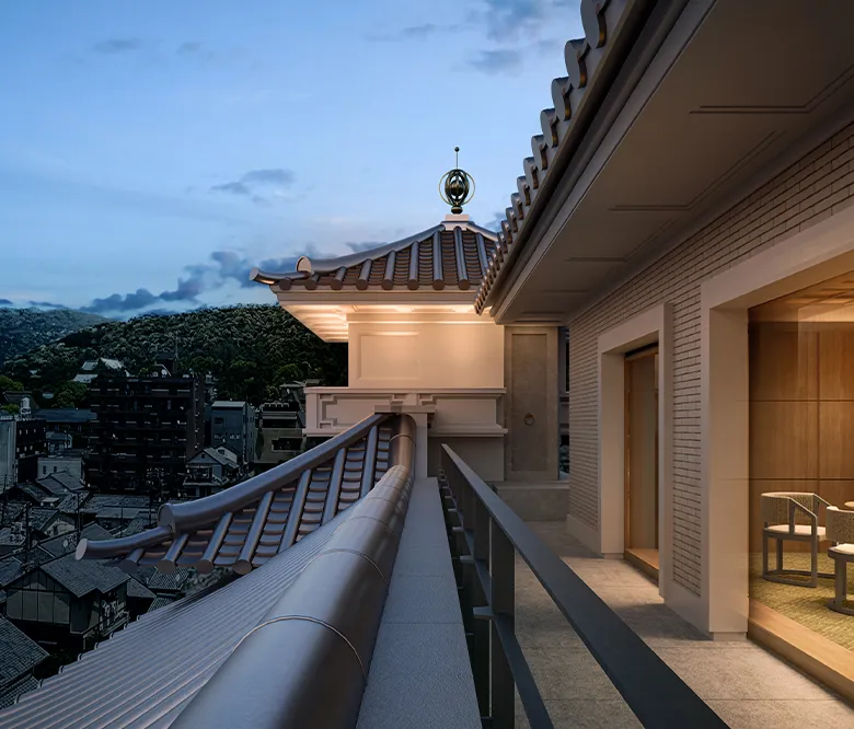 The expansive 57㎡ terrace, extending to the north and east, unveils a breathtaking panorama. The picturesque streets of Gion and the majestic Higashiyama mountains unfolding before you. Inside, the suite offers a generously sized living room with a mini-kitchen and a serene bathroom complete with a mist sauna. Embraced by the warmth of natural materials, this exceptional space invites you to indulge in the ultimate luxury and tranquility unique to the Imperial Hotel ,Kyoto, all within this singular space that offers an intimate perspective of the Yasaka Kaikan's prominent bell tower.