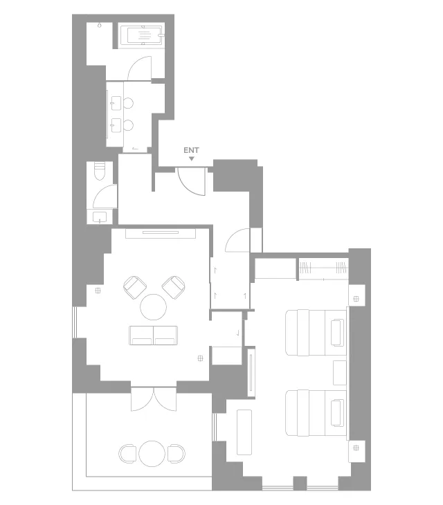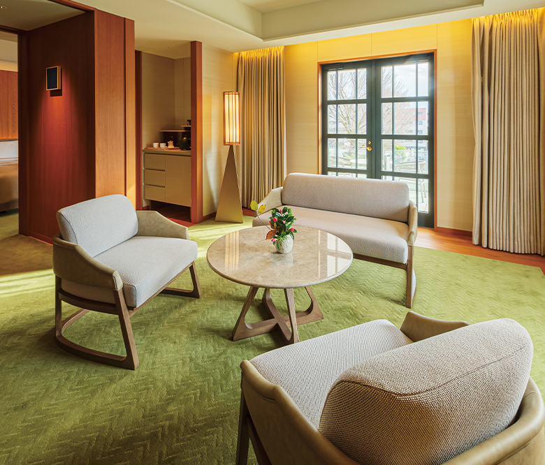 Set within the conservation area of the main building, this is genuinely an unparalleled space, offering the intense connection to the history and vitality of the Yasaka Kaikan. The architectural details of the former theater's stage prop entrance have been carefully maintained, and the balcony places you face-to-face with the Yasaka Kaikan's roof and its intricate terracotta wall patterns. Surrender to unparalleled comfort and timeless tranquility, inspired by the eternal spirit of Kyoto.