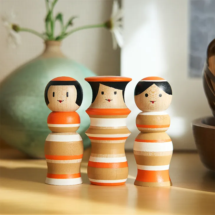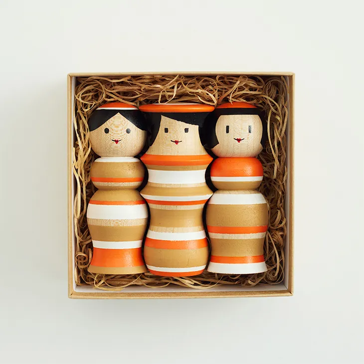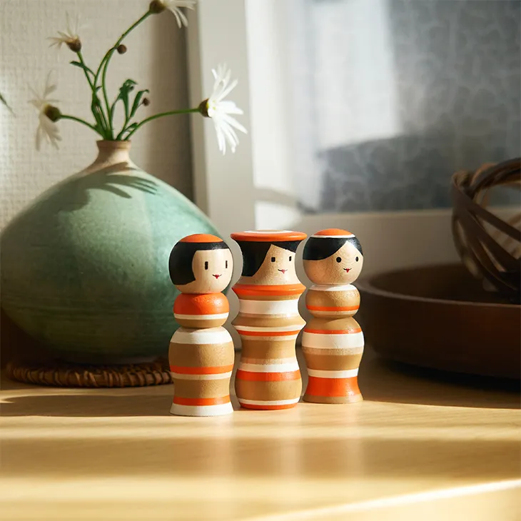 Kokeshi dolls are a traditional Japanese craft, hand-carved from wood and long cherished as gifts symbolizing wishes for happiness and well-being. This exclusive design, in a special color palette created for the Imperial Hotel, features three interlocking dolls that represent the deep bonds between people. A contemporary interpretation of a classic form, this Kokeshi makes for a meaningful and artistic keepsake from your journey.