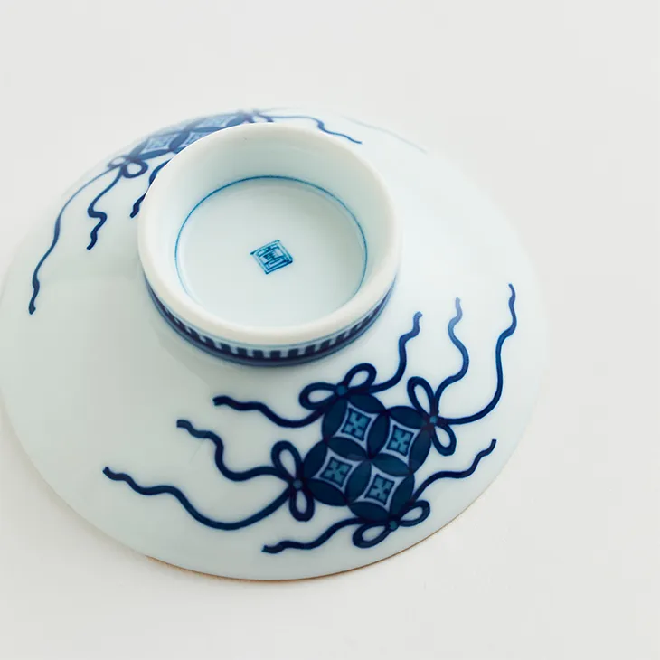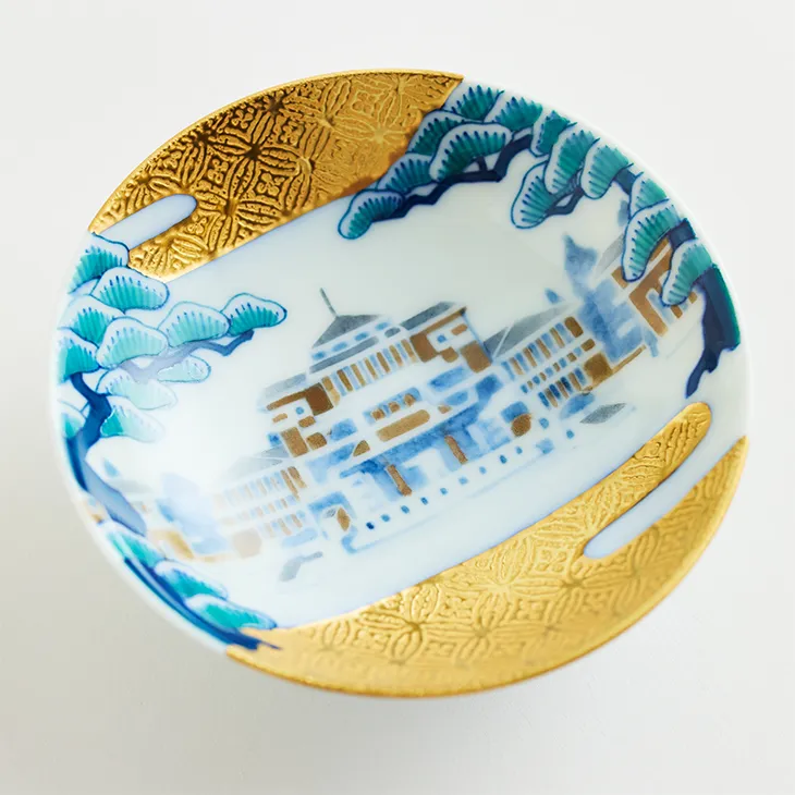 This large Nabeshima ware sake cup was produced by Hatamantouen, a famous Imari ware kiln in Saga Prefecture, with the Imperial Hotel's second main building, the Wright Building, as its motif. The Shippo Tsunagi Matsumon (a traditional Japanese motif of good luck) and the building peeking through the gaps in the pine forest are expressed in three dimensions with delicate lines and overlapping pale colors. This special masterpiece captures the essence of Japanese porcelain excellence, featuring high decorativeness and technical skill, meticulously painted down to the smallest detail using the traditional technique.