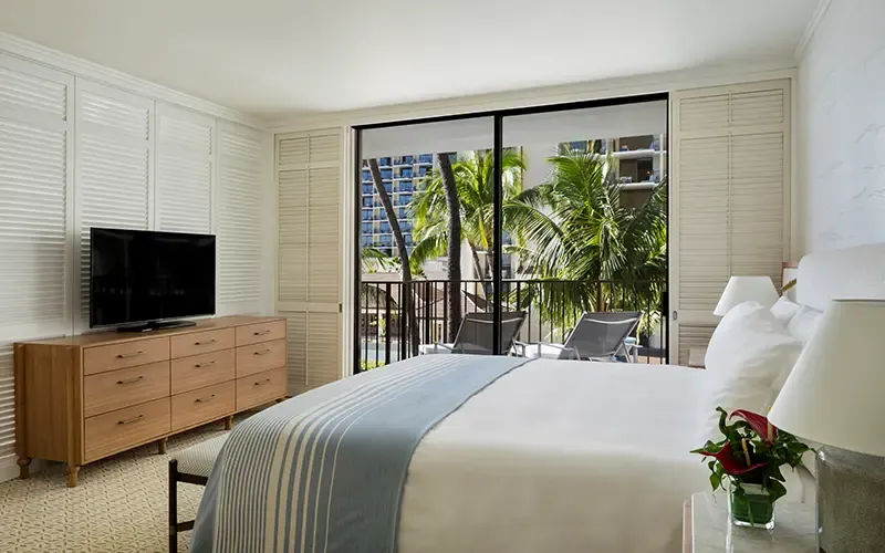 プール横2階に位置するワンベッドルームのスイート。客室からは、ヤシの木が真っ青な海と空に映えるハワイならではの風景が目の先で広がり、リゾートらしい寛ぎにあふれています。プールやビーチへのアクセスも良いため、神聖な空気が漂う朝のビーチをぜひ散歩されて、すがすがしい1日の始まりをお迎えください。