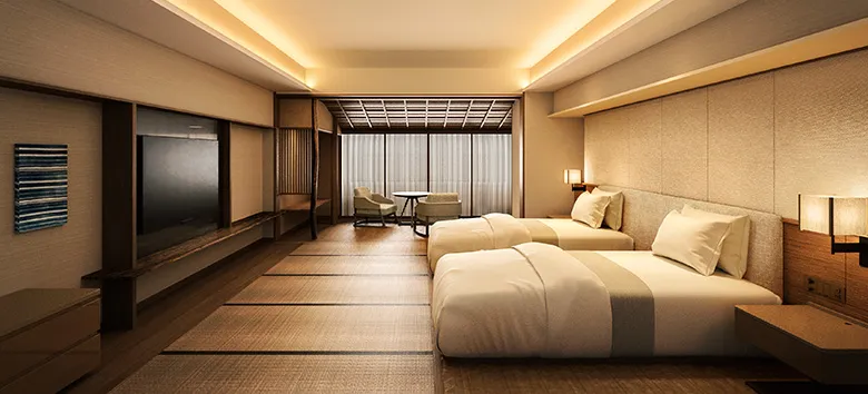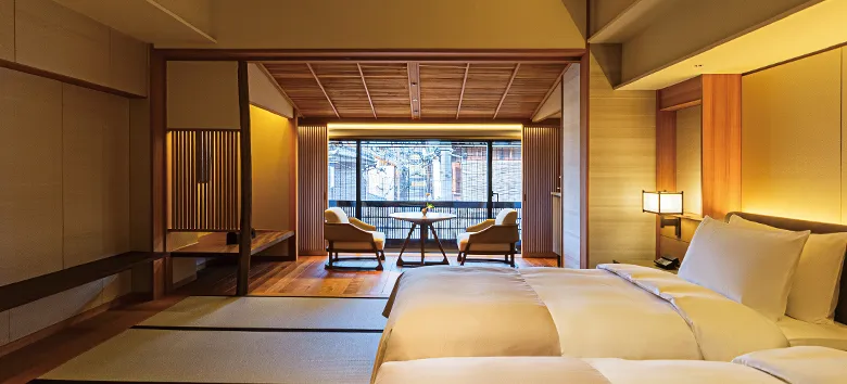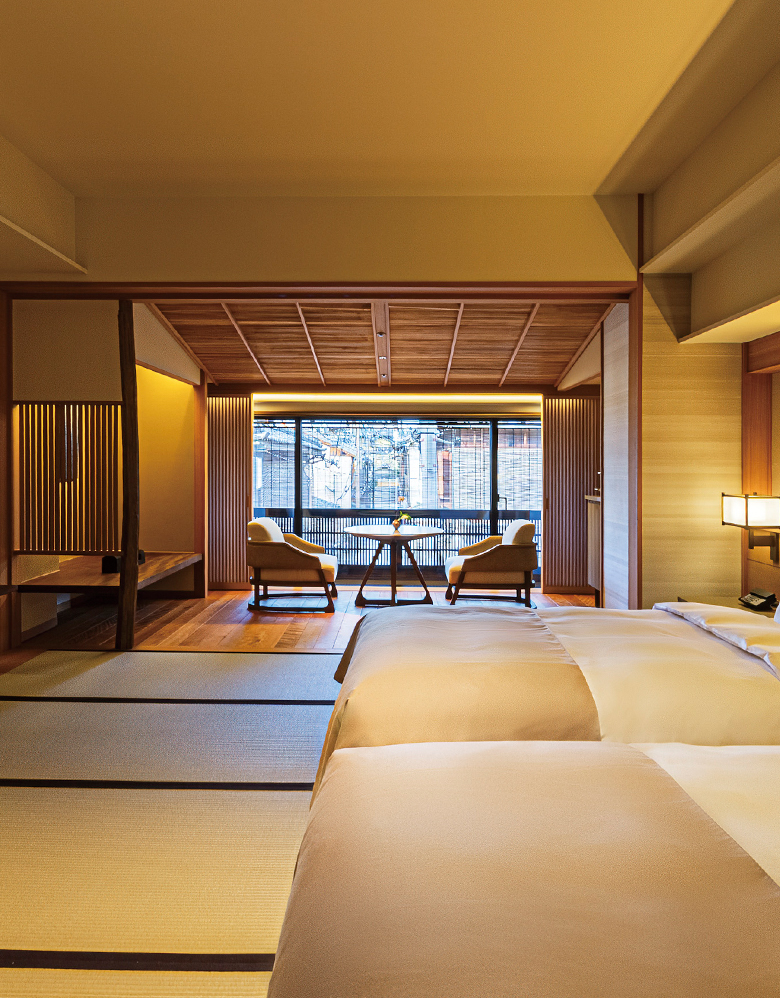 祇園の伝統的な町並みと調和し、畳を設えた和モダンの客室です。
