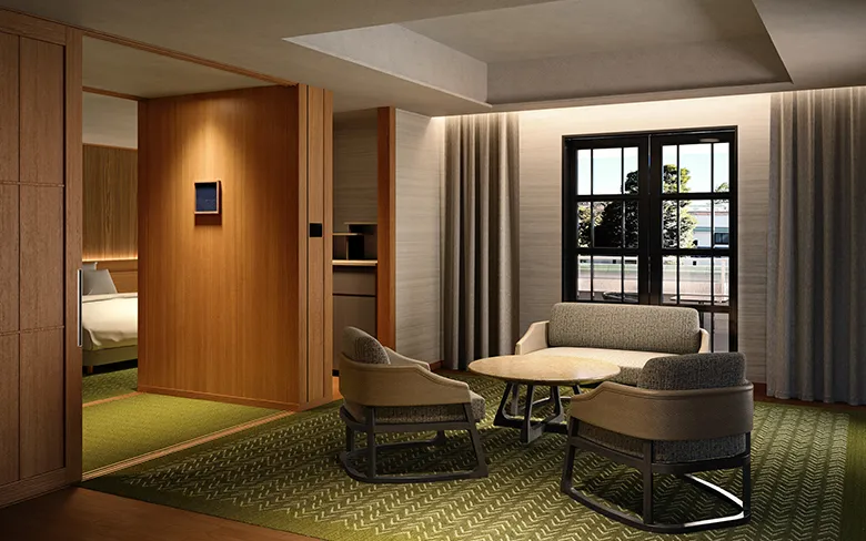 弥栄会館のレガシーと帝国ホテルのホスピタリティが息づくスイート。本棟正面中央に位置し、堂々とした、そしてゆったりとした空間で、時を超えた寛ぎをお楽しみください。