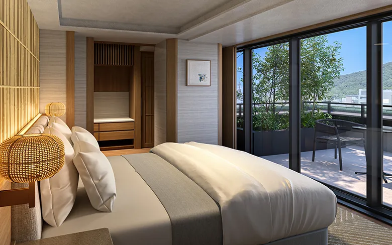 バルコニーから祇園の絶景を望み、祇園の非日常と弥栄会館の歴史を五感で感じ、広々とした100㎡の空間で心ゆくまで贅沢な滞在をお楽しみください。