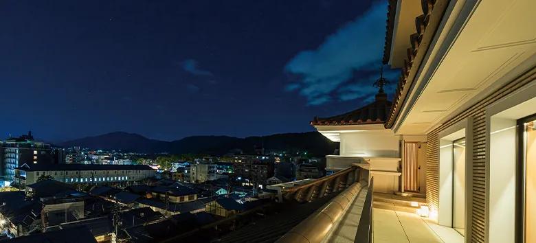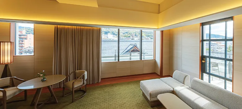 京都の町並みを眺められる最上階に位置するペントハウススイート。開放的な空間で、バルコニーの先に広がる東山を正面に捉えた景観を感じながら、寛ぎのひとときをお過ごしください。