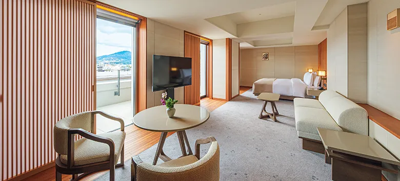 128㎡の広さを誇る客室と、東山の山並みを正面に望む圧倒的なテラスを兼ね備えた帝国ホテル 京都の最上位スイートです。祇園の文化を感じながら帝国ホテル 京都ならではの空間をお楽しみください。