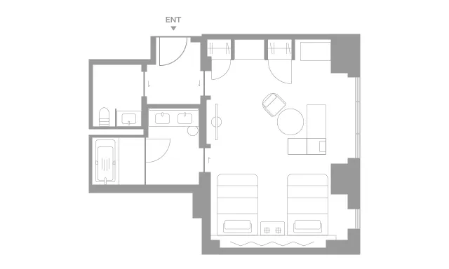 弥栄会館時代のシルエットを継承しながら、モダンで洗練されたデザインが心地よい、ゆとりのある空間です。窓から広がる京都の町並みは、時間とともにその表情を変え、早朝の静寂から夕暮れの賑わいまで、刻々と移りゆく京の風情をお楽しみいただけます。