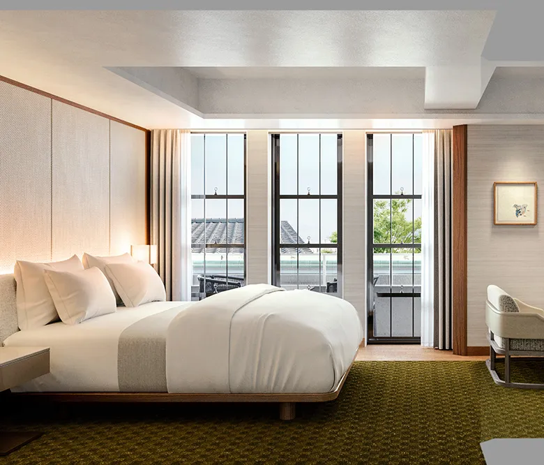 弥栄会館の名残が色濃く残る空間に、バルコニーの開放感が加わります。バルコニーに出れば、祇園甲部歌舞練場の威厳ある姿や、花見小路を行き交う人々の気配が間近に迫り、歴史と文化が織りなす特別な情景を望む至福の時間をお過ごしいただけます。