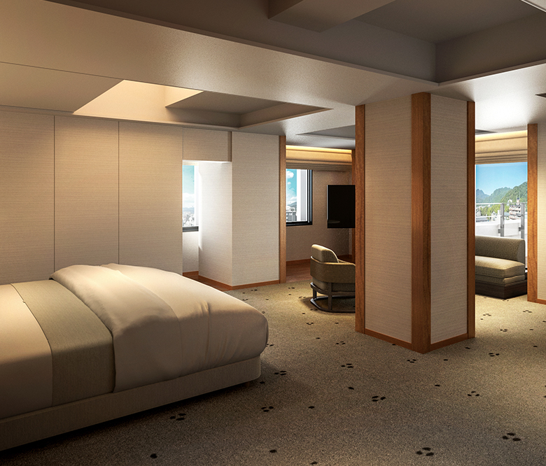 73㎡のゆったりとした空間は、弥栄会館の歴史を感じさせる落ち着いた雰囲気と、洗練された現代的な快適性が調和し、京都の眺望とともに心に残る寛ぎのひとときを演出します。
