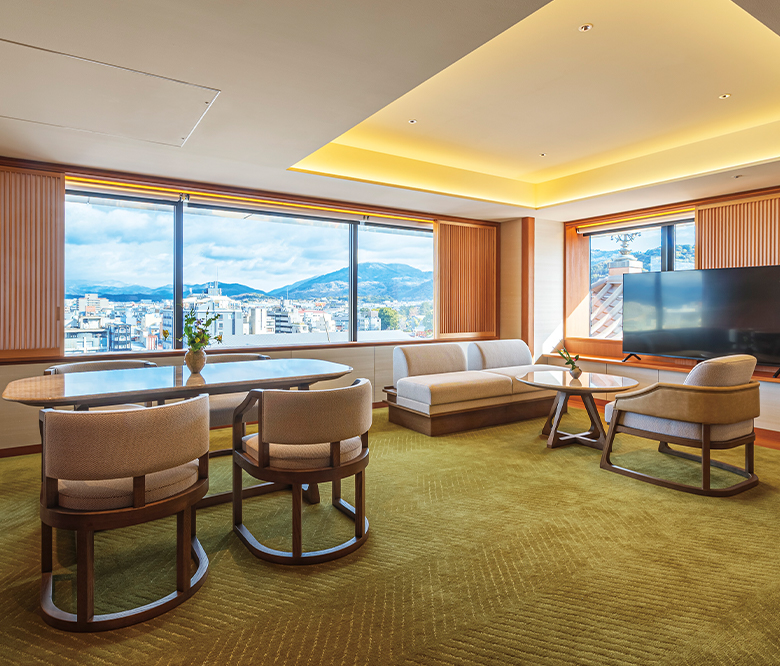プライベートな空間は、広さ95㎡を誇り、京都の街並みを眺められる15㎡のバルコニーを備えています。広々としたビューバスにはミストサウナも完備。併設のバーへは専用の通路でアクセスでき、弥栄会館の歴史とモダンデザインが調和した空間で、古都の風情に浸りながら、特別な時間をお過ごしいただけます。