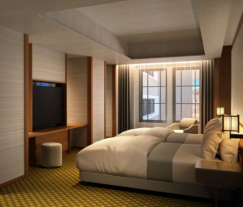 弥栄会館が持つ歴史と、現代の洗練されたラグジュアリーが融合した特別な空間です。ゆとりあるリビングエリア、そして伝統と呼応するモダンなインテリアが、お客様に寛ぎと、記憶に深く刻まれる滞在体験をお約束いたします。