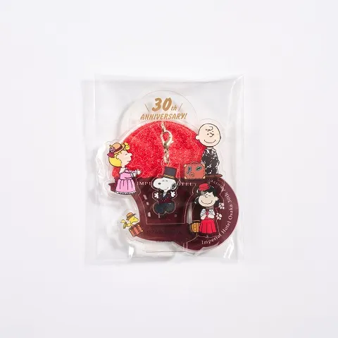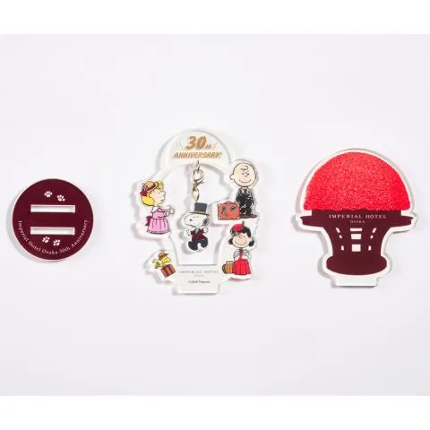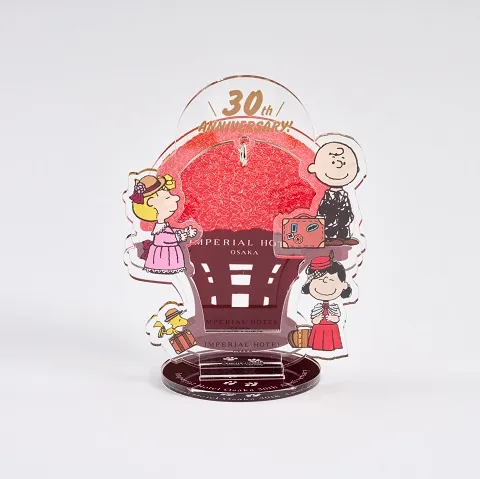 帝国ホテル 大阪開業30周年記念商品し、ホテルのメインロビーの装花として人気の赤いバラのプリザーブドフラワーを背景に、帝国ホテル 大阪の開業当時のドアマンの制服を着た「ドアマン・スヌーピー」と仲間たちをあしらったアクリルスタンドを作成しました。