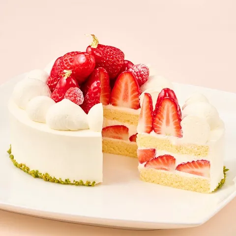 北海道産の2種の生クリームを程よくブレンドし、乳味がある、キレのよいクリームに仕上げました。ふんわり、しっとりのスポンジと、苺と生クリームのハーモニーをお楽しみいただける、記念日におすすめのショートケーキです。