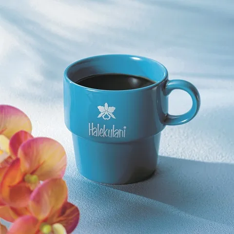 表面にハレクラニロゴマーク、裏面に帝国ホテルロゴマークをあしらった、鮮やかなハレクラニブルーのスタッキング可能なマグカップです。
