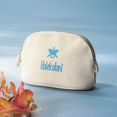 表面にハレクラニロゴマーク、裏面に帝国ホテルロゴマークを あしらった、オリジナルポーチです。リネンのような手触りでハワイ らしさをイメージし、内側はハレクラニブルーの布地で仕立てました。