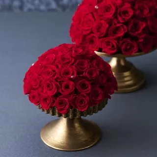 「赤いバラのロビー装花」をミニチュアサイズに仕立てたプリザーブドフラワーです。大・小の2種類をご用意し、どちらにも50本のバラを使用しています。50本のバラには「永遠」という花言葉があり、特別な日に贈る祝い花としてもおすすめです。