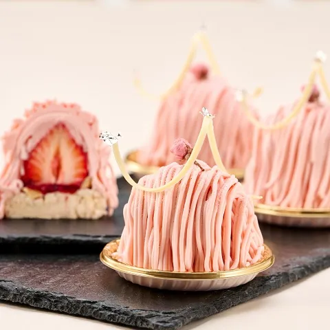 みずみずしい苺に桜餡と求肥をあわせ、苺風味のホワイトチョコレートクリームでモンブランに仕上げました。
