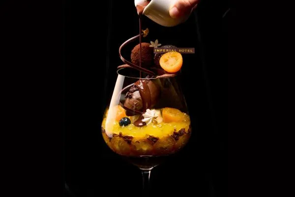 冬に旬を迎える金柑と、フランスのチョコレートブランド「ヴァローナ」のチョコレートを3種類使用し、濃厚で見た目も華やかなパフェに仕上げました。ホットチョコレートソースをかけることでより濃厚な味わいをお楽しみいただけます。