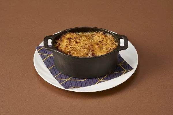 たっぷりの玉ねぎをじっくりと炒め、コンソメスープとチキンブイヨンで煮込み、バゲットとチーズをのせて焼き上げたフランスの伝統的なスープです。香ばしいチーズと玉ねぎのコクが特徴的で寒い日にぴったりのスープです。