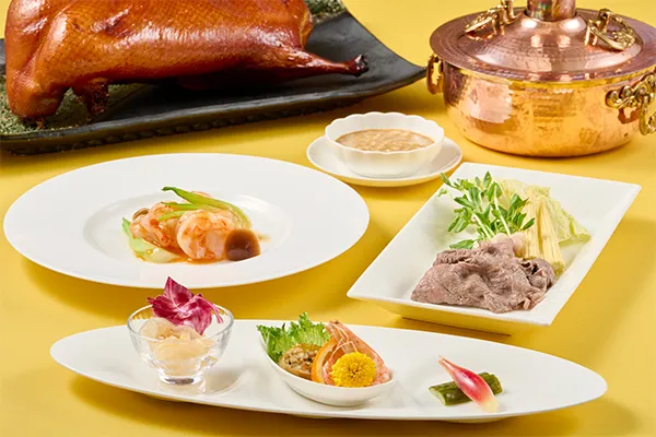 定番の北京ダックや壺蒸しスープに加え、国産牛サーロインの湯引き、ガーリック風味で仕上げた鮑の姿蒸しなどをお楽しみください。