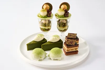 抹茶の 奥深い味わいを存分にお楽しみいただけるよう「京都 福寿園」の厳選された香り高い抹茶を スイーツに使用しています。また、抹茶とチョコレートを合わせた口当たりなめらかな「抹茶香るホワイトチョコレートムース」や、きな粉の香ばしさが抹茶の風味を引き立てる「抹茶と きな粉のパフェ」など、和と洋の素材が織りなすマリアージュもお楽しみいただけるほか、期間限定のドリンクもご用意いたします。