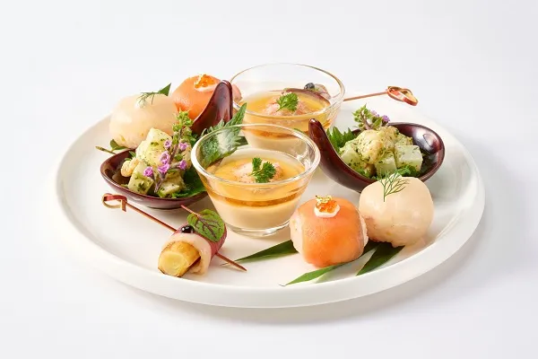 フレンチドレッシングで味付けしたライスサラダを手毬寿司風に仕上げました。しっとりとしたスモークサーモンと淡麗な味わいの真鯛がライスサラダと調和します。