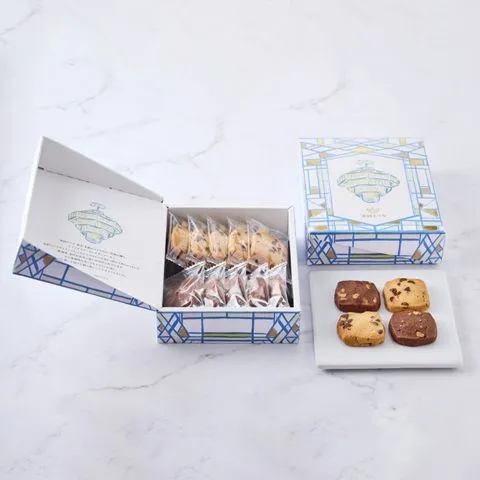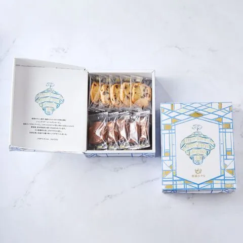 帝国ホテル 東京のメインロビーに輝く、金色のバラをイメージしたシャンデリア「ゴールデンローズ」のイラストをデザインした紙製ブック型パッケージに、チョコレートを使用したクッキーを2種類詰め合わせました。