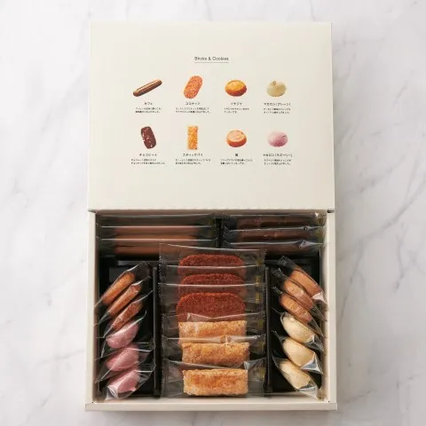 風味豊かで軽やかな食感のスティックパイ、白とピンク色のマカロンなど8種を詰め合わせました。