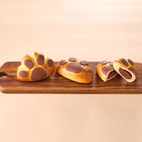 猫の肉球を模したクッキー生地を重ねたふんわりとしたパンに、チョコレートクリームを包み焼き上げました。