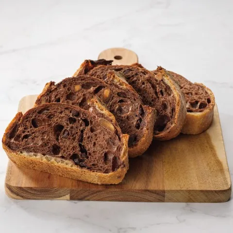 ショコラ風味のカンパーニュ生地に、フランス産のチョコレートチップやローストしたアーモンドを加えて焼き上げました。 外はカリッと中は軽めでしっとりとした食感のパンに、チョコレートチップとアーモンドでアクセントを効かせました。 温めても美味しくお召し上がりいただけます。