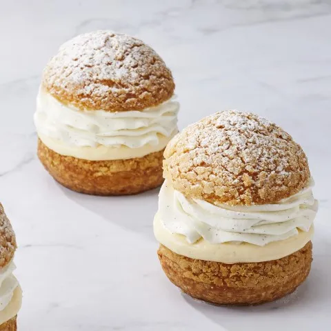 サクサクに焼き上げたシュー生地に、バニラ風味の生クリームとカスタードクリームをたっぷりと絞りました。
