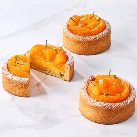 ブリオッシュフィユテ生地に、アーモンドクリーム、ジェノワーズ、みかんのコンフィチュール、コアントローに漬けて美味しさを引き出した国産みかんを重ね、ローズマリーと ピスタチオを飾りました。