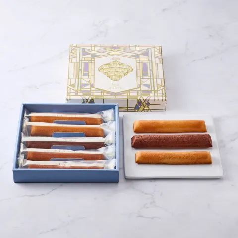 帝国ホテル 東京 本館のメインロビー中央に輝く、金色のバラをイメージしたシャンデリア「ゴールデンローズ」のイラストをあしらったパッケージに、スティック型の焼菓子を3種類詰めました。