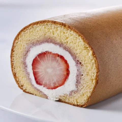 まるごとの苺と濃厚なクリームを甘酸っぱい苺のピューレをしみ込ませたしっとりとしたロール生地で巻きました。