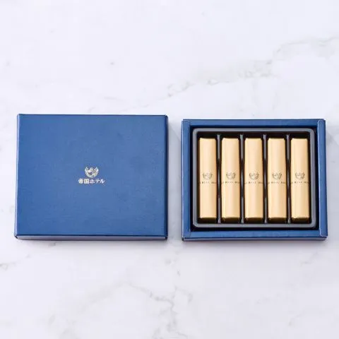 帝国ホテル2代目本館(通称「ライト館」)の外壁のスクラッチタイルを模した、スティック型のマーブルチョコレートを、帝国ホテルのロゴを箔押しした紺色の箱に詰めました。