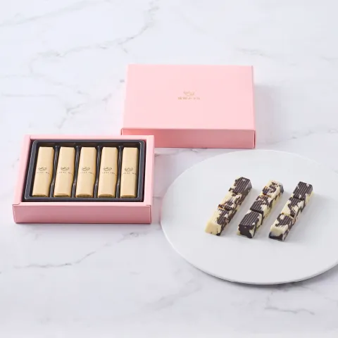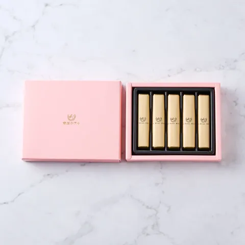 帝国ホテル2代目本館(通称「ライト館」)の外壁のスクラッチタイルを模した、スティック型のマーブルチョコレートです。パステルピンクの箱には、帝国ホテルのロゴマークを箔押しでデザインしています。