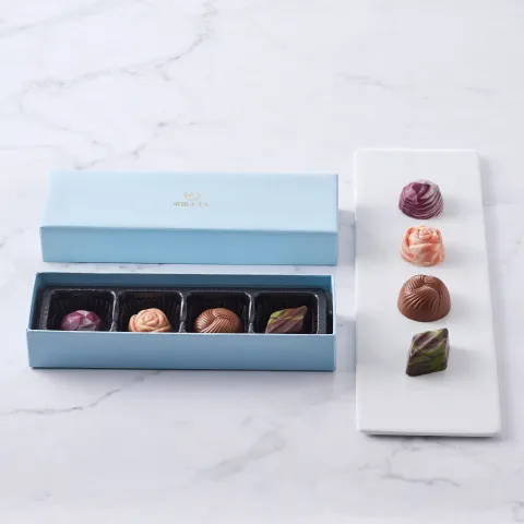 4種類の粒チョコレートを詰め合わせた期間限定のボックスです。水色の箱には帝国ホテルのロゴを箔押しでデザインしています。
