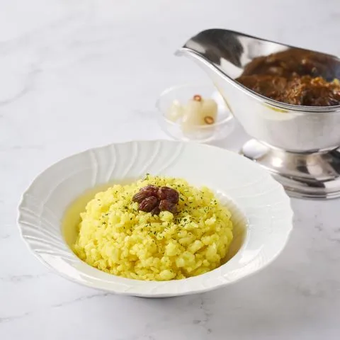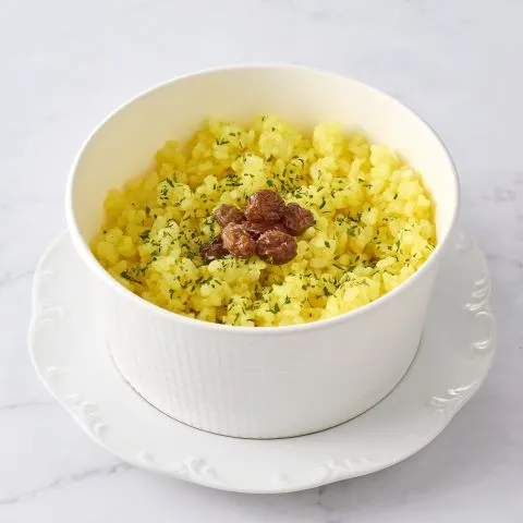 鮮やかな黄金色が特徴のターメリックライスにパセリとレーズンをトッピングしました。