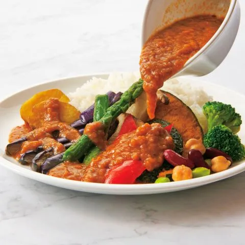 人参と玉ねぎのみじん切りをバターでしっかりとソテーし、野菜の旨味を十分に引き出した帝国ホテル伝統のカレーソースは、素材の旨味と食感を存分にお楽しみいただけます。なす、じゃがいも、ブロッコリー、パプリカ、アスパラガス、エリンギ、かぼちゃ、ミックスビーンズなどの彩り鮮やかな10種類の野菜とともにお召し上がりください。