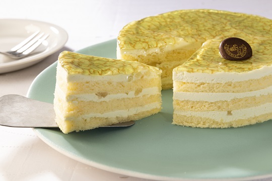 メロンの果肉を4.4%使用したこちらのケーキは、みずみずしいメロンの爽やかな味わいが夏にぴったり。カットすると、交互に重ねられたカスタードクリームベースのメロンムースとスポンジ生地が、美しい層を成しています。中にはシロップ漬けのドライメロンが入っており、食感のアクセントに。メロンの網目模様を表現したクレープ生地の、可愛らしさが目を引きます。