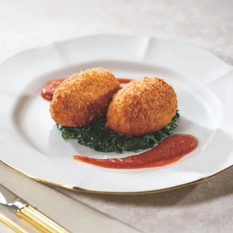 ズワイガニとベシャメルソースで仕上げたカニクリームコロッケを、トマトソースと一緒にご用意いたしました。