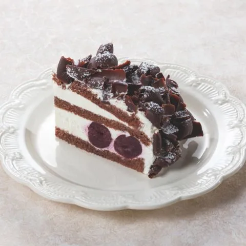 チョコレートのスポンジとダークチェリーに、キルシュをきかせた生クリームを重ねました。