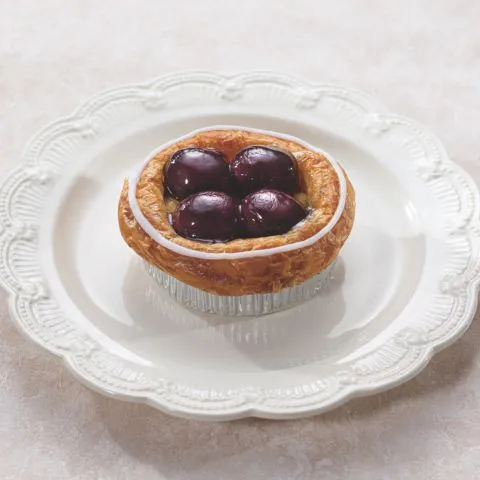 デニッシュ生地にグランマルニエを加えた濃厚なカスタードクリームを重ねて、キルシュ香るダークチェリーを乗せて焼き上げました。