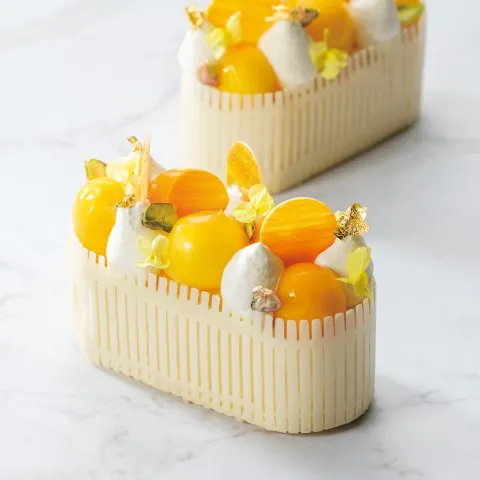 果肉感のあるマンゴーのコンフィチュールとピスタチオ風味の生地を、口どけの良いマンゴーのムースで包み、黄色のエディブルフラワーやチョコレートなどを飾りました。