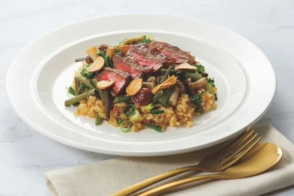 ガーリックが香る、山菜を混ぜ込んだ和風のピラフです。照り焼きにした柔らかい牛フィレ肉や、シャキシャキとした山菜の食感をお楽しみいただける一品です。