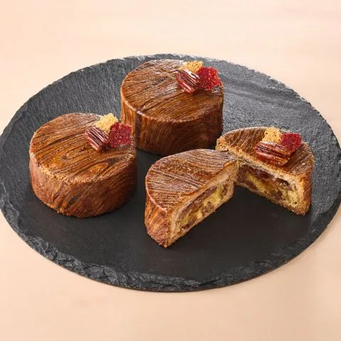 バターの風味豊かなブリオッシュフィユテ生地で、カルヴァドスに漬け込んだりんごを一玉丸ごと丁寧に包み込みました。中心にはバニラ香るりんごペーストを加え、豊かな味わいに仕上げています。