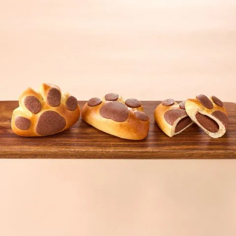 猫の肉球を模したクッキー生地を重ねたふんわりとしたパンに、チョコレートクリームを包み焼き上げました。