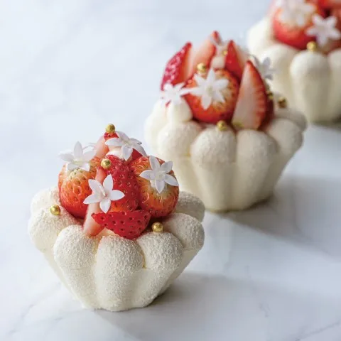 苺とホワイトチョコレートの2種類のムースに、甘酸っぱいフランボワーズのコンフィチュールがアクセントの口どけの良いケーキです。